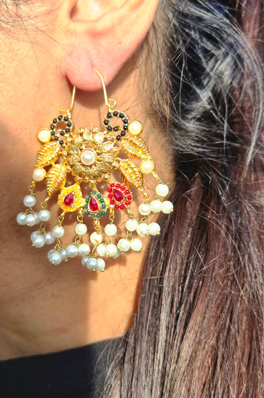 The Mughal Karanphool Drops | Enamel & Pearl Floral Chandelier