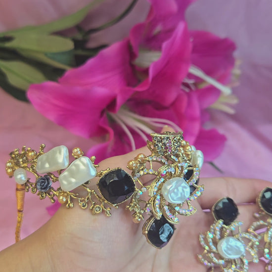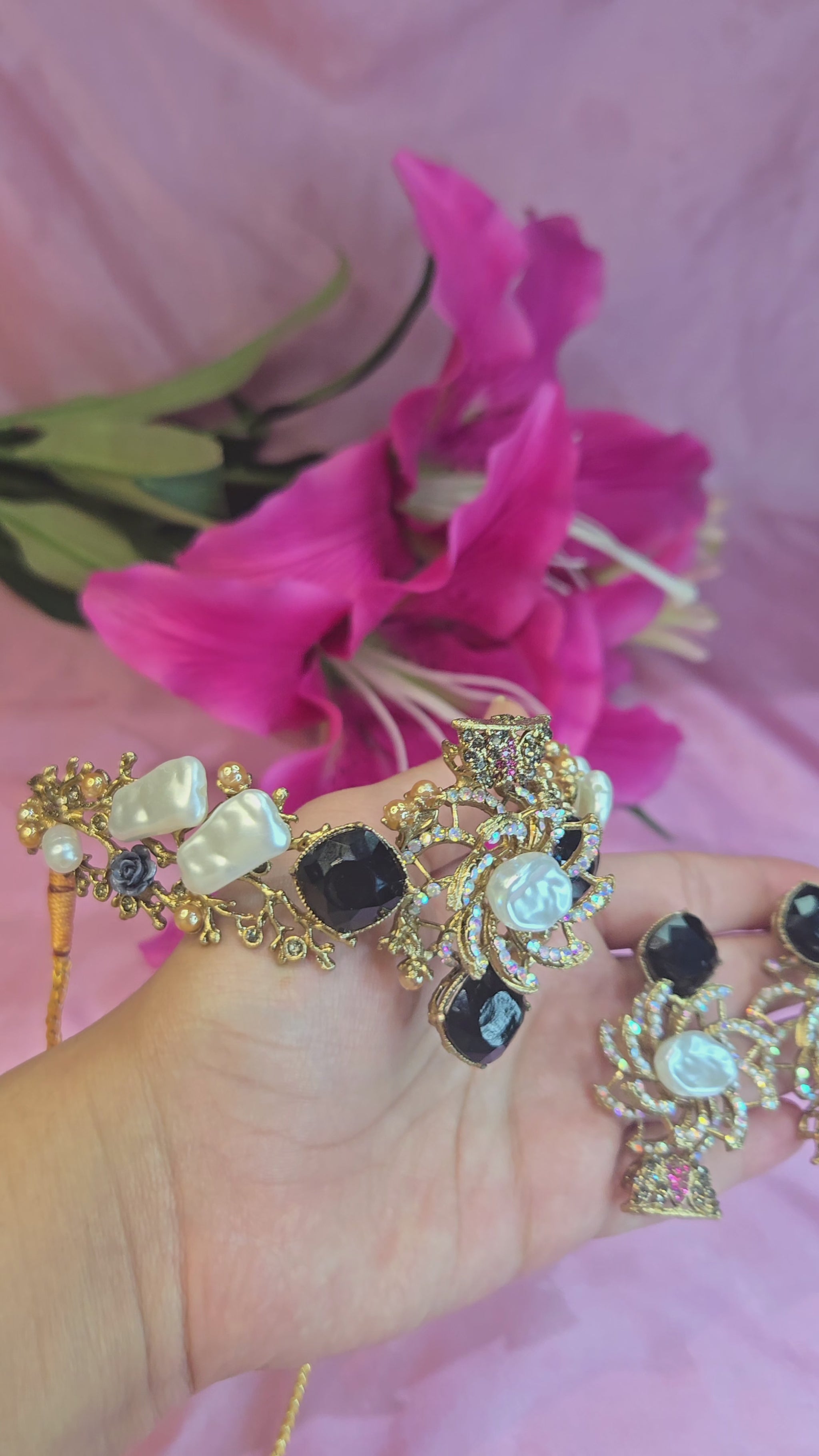 Midnight Petal | Black Crystal & Baroque Pearl Gold Choker Set (Gold-plated)