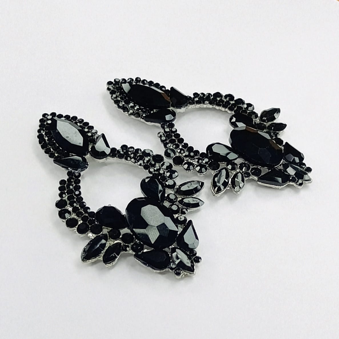 The earring features a prominent scalloped hoop or curved chandelier frame that sits wide and slightly below the ear. This hoop is entirely encrusted with rows of small, glittering crystals.