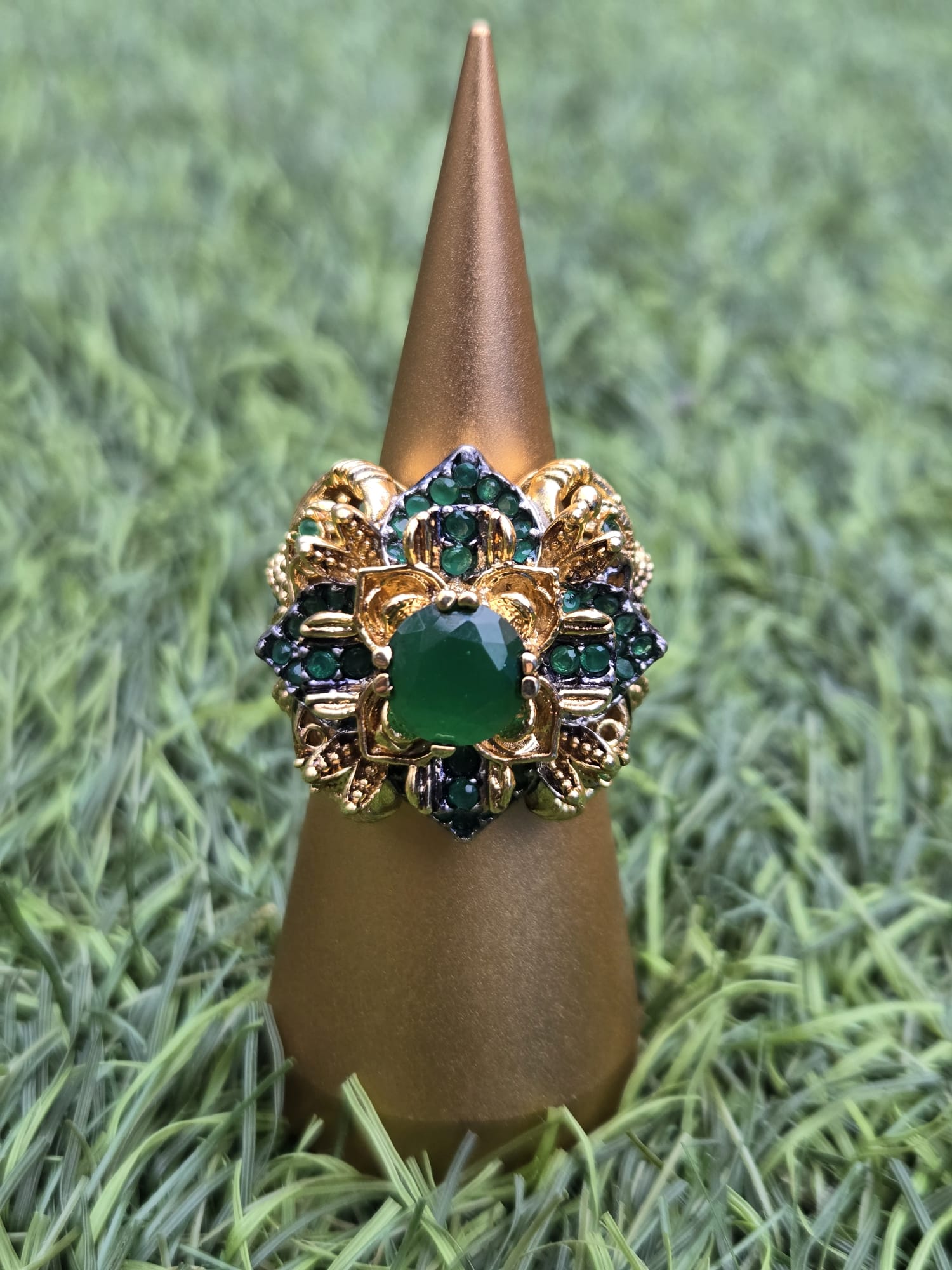 Embrace artisan luxury with The Platerá Ring, a unique, multi-stone cluster piece available exclusively from TAZIl. This phenomenal ring features a wide, domed design built from an intricate cluster of multi-faceted gemstones set in a flourishing, sculptural arrangement.