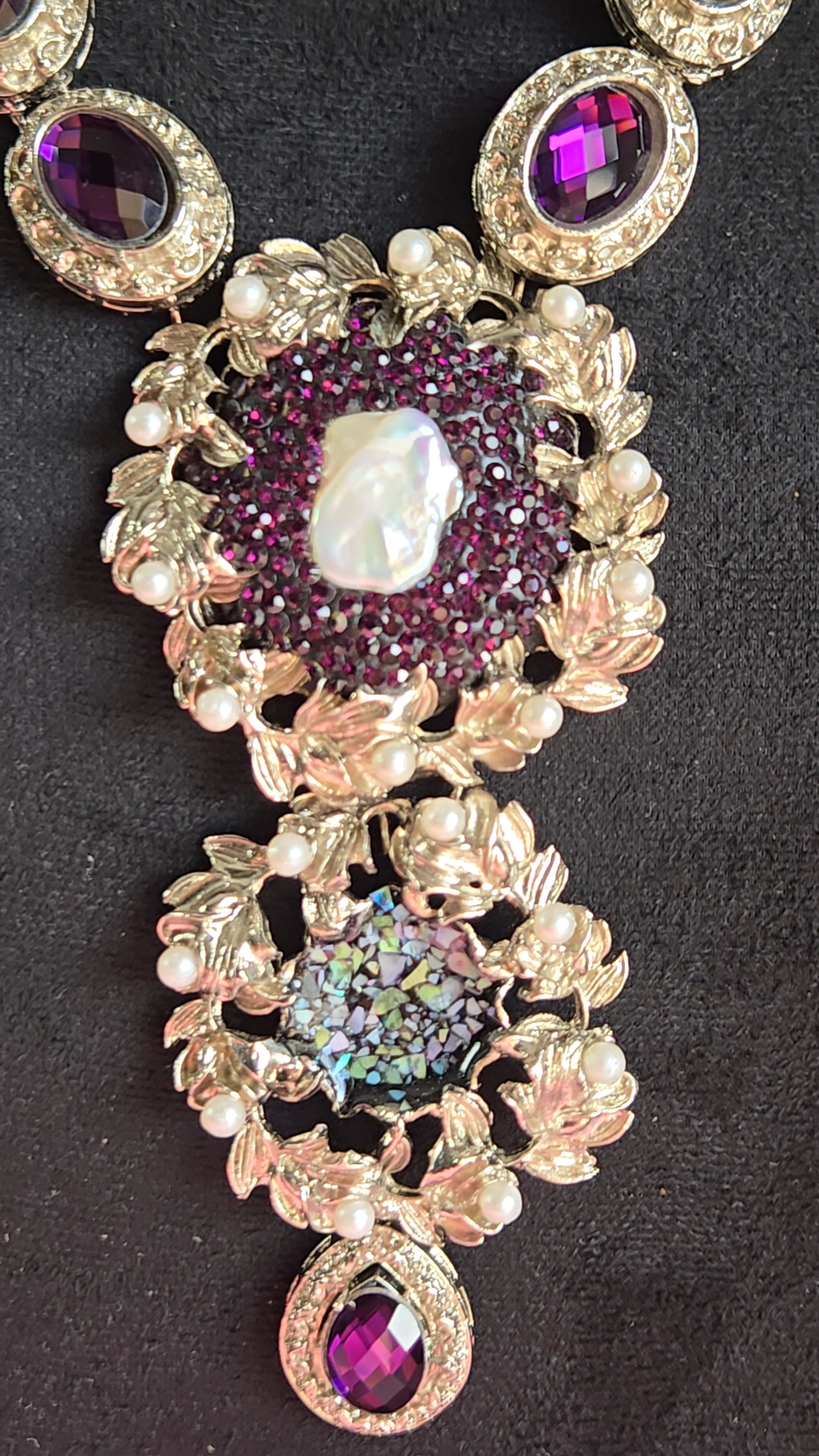 The magnificent statement necklace features a striking Cameo-style relief at the center, set amidst a cluster of shimmering accents, including iridescent blue/green crushed stone and delicate micro-pearls. The main garland is comprised of polished, deep purple oval gemstones (reminiscent of amethyst), all set in an ornate, antique silver-tone metalwork that speaks of timeless heritage.