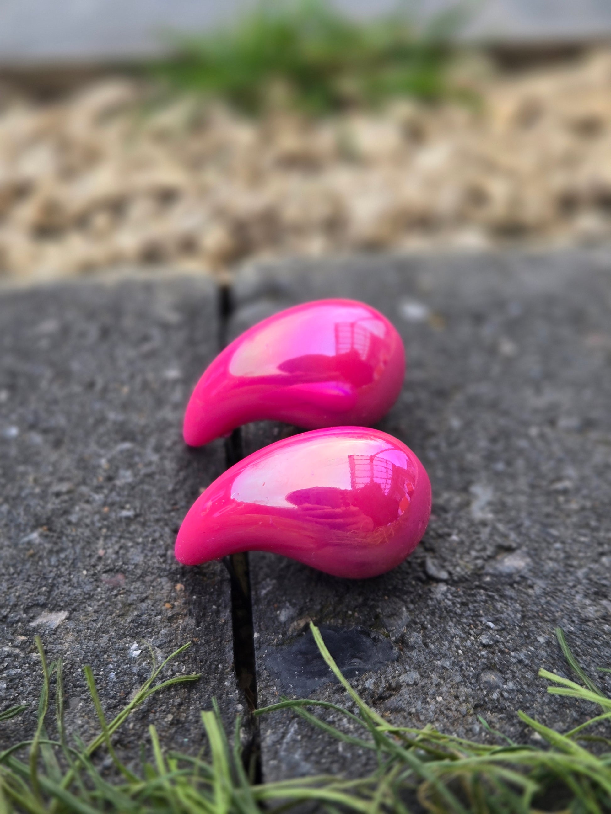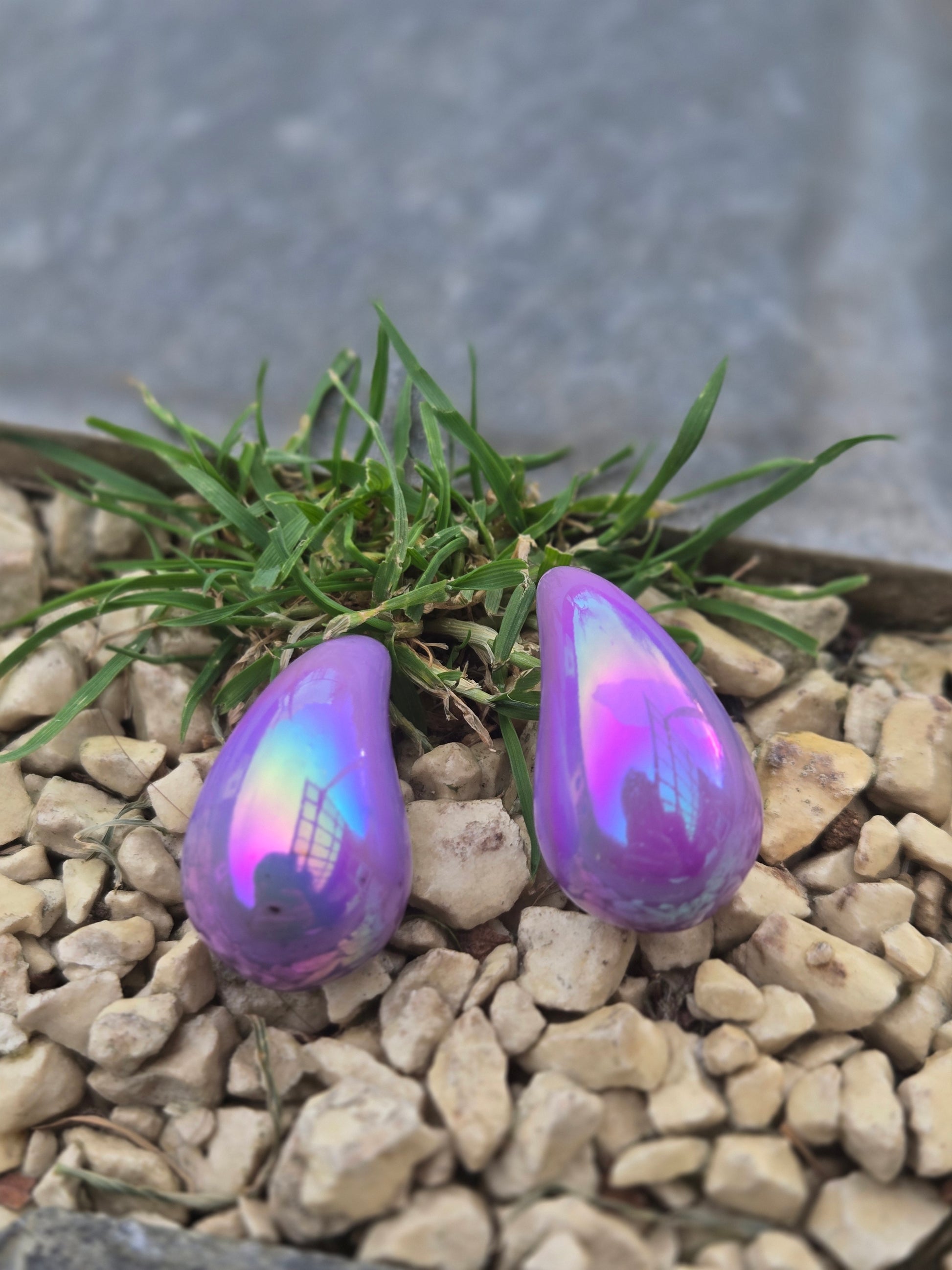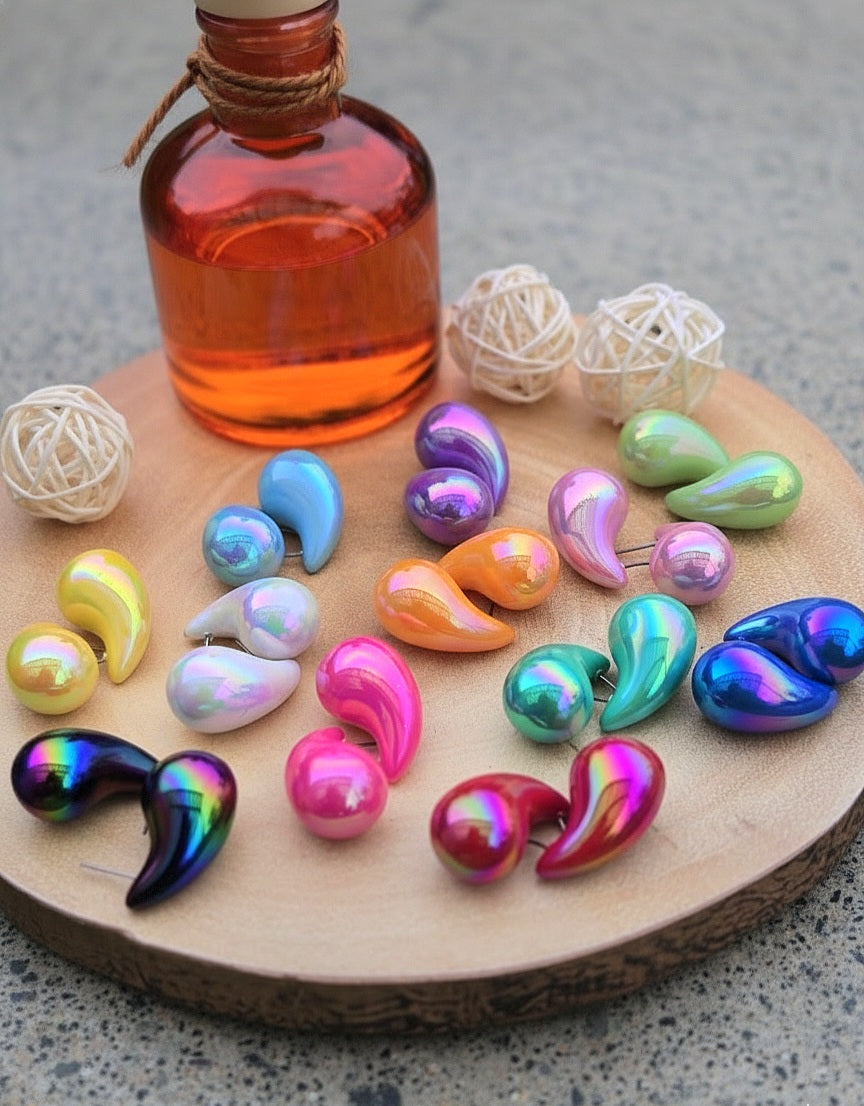 The unique finish causes the colour to shift and shimmer with movement, like a mermaid's tail! Choose from a stunning range of hues, including vibrant electric blue, deep sapphire purple, rich magenta pink, glowing lime green, and luminous white. The small, comfortable size makes them perfect for everyday wear, adding a bold pop of colour and shine.